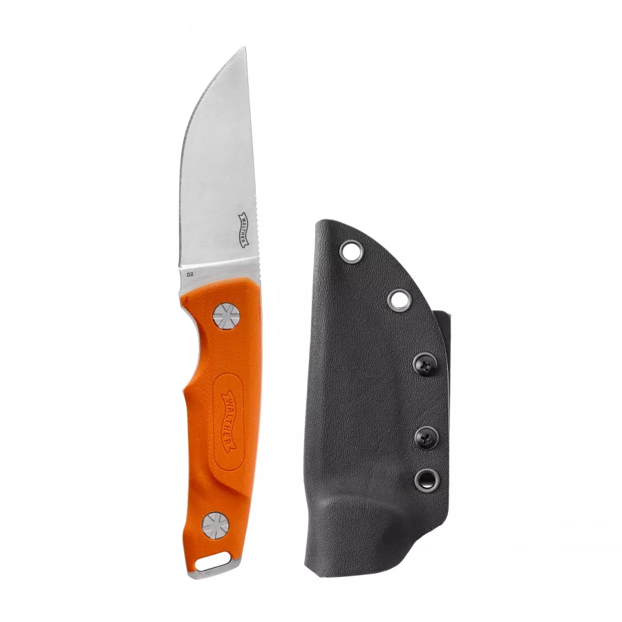 Chwyt noża Walther HBF 1 wykonany został z niezwykle trwałego a przy tym higienicznego kompozytu G10. Materiał ten bazuje na tkaninie z włókna szklanego sprasowanej przy pomocy żywicy i charakteryzuje się ekstremalną wytrzymałością. Kontrastowy kolor zastosowanego tworzywa sprawia, że nóż myśliwski HBF 1 jest niezwykle łatwy w odnalezieniu po upadku w ściółkę lub trawę. Odpowiedni profil chwytu sprawia natomiast, że model jest niezwykle wygodny oraz bezpieczny w użytkowaniu. Dzięki zastosowaniu kydexowej pochewki nóż jest niezwykle łatwy w dobyciu. Nie musimy ponadto obawiać się o jej kondycję umieszczając w niej ubrudzone narzędzie – syntetyczna konstrukcja jest bardzo łatwa w czyszczeniu.