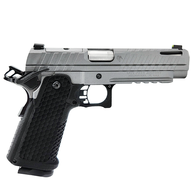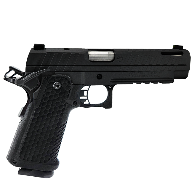 Najnowsze „dziecko” firmy to pistolet LFA Apollo 11 w kalibrze 9×19 mm. Pierwszy rzut oka wystarczy, aby stwierdzić iż jest to nowoczesna wariacja klasyki – czyli Colta 1911, a właściwiej (ze względu na dwurzędowy magazynek oraz polimerowe okładziny chwytu) to 2011, gdyż tak określa się tego typu pistolety. Wygląd przynosi na myśl skojarzenia zarówno z bronią znaną z cyklu filmów John Wick (szczególnie pistoletu PIT Viper) czy też innych sportowych modeli STI. Choć raczej na wyglądzie podobieństwo się kończy. Pistolet wykończony jest prościej niż wymienione topowe modele.W tym jednak wypadku prościej nie oznacza gorzej. Mamy ciekawie wykonany zamek z wycięciami odciążającymi w przedniej części, z całkiem sporymi nacięciami zarówno z przodu jak i z tyłu, z wycięciem pod montaż kolimatora w standardzie RMSc. Zamek wykonany ze stali nierdzewnej, pokryty jest powłoką Cerakote (do wyboru wersje: czarna, FDE i Elite Grey). Stalowy szkielet posiada szynę akcesoryjną 1913 oraz standardowe dla pistoletów 1911 / 2011 manipulatory: mały zrzut zamka i powiększony, sportowy, obustronny bezpiecznik manualny.Do tego oczywiście bezpiecznik chwytowy przechodzący w ostrogę chroniącą dłoń przed pracującym kurkiem, który jest szkieletowy, podobnie jak spust. Spust to typowy dla 1911 SIngle Action (pojedynczego działania) z płynną pracą, niewielkim ciężarem i krótkim resetem. Polimerowy chwyt, wraz z kabłąkiem spustowym wykonany jest z polimeru (metodą druku 3D) i posiada teksturę typu rybia łuska, nie za agresywną, taką wręcz „w sam raz”. Pistolet zasilany jest ze stalowych, dwu-rzędowych magazynków, mieszczących 17 naboi 9×19 mm. Całości dopełnia gruba, meczowa lufa, zapewniająca doskonałe chłodzenie i wysoką precyzję strzałów.