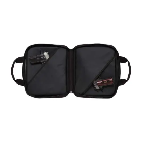 Solidna torba na dwa pistolety. Stworzona z wytrzymałej tkaniny poliestrowej dwiema wyściełanymi wewnętrznymi kieszeniami na pistolet. Posiada także dwie duże kieszenie boczne zapinane na zamek na magazynki, amunicję i akcesoria. Idealny na szybką wycieczkę na strzelnicę, ten futerał zapewnia doskonałą ochronę i przechowywanie magazynków, paczek z amunicją i akcesoriów. Konstrukcja z klapką umożliwia szerokie otwarcie walizki w celu łatwego dostępu do pistoletów. Dwie duże zewnętrzne kieszenie umożliwiają uporządkowanie niezbędnych akcesoriów strzeleckich.